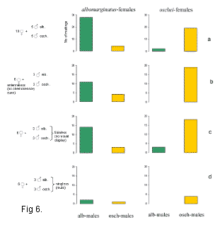 We studied whether the females of two closely related species Chorthippus albomarginatus and Ch. oschei distinguish between con- and heterospecific courtship songs. Although these courtship songs differ in many temporal parameters, the two species are known to hybridize in nature. In choice mating experiments, the females were found to mate rather assortatively with conspecific males, but in 10-20 % of cases they mated with heterospecifics (Fig. 6a). We studied which component of the complex courtship (chemical, visual or acoustic) was the most crucial for conspecific recognition (Fig. 6b-d). The data obtained showed that the acoustic component was the most important for the recognition. The males without wings courted and made copulation attempts as actively as the intact males; however, the percentage of matings was low because the females refused to mate (Fig. 6d).